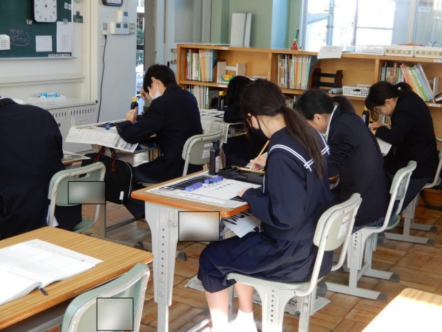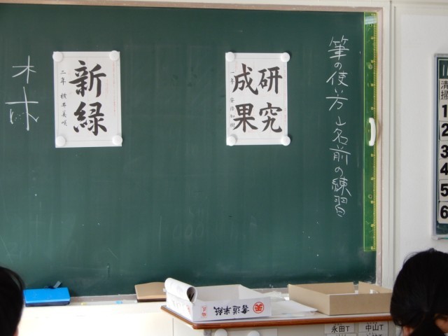 集中して書写に取り組んでいるようでした。自分の名前のお手本も参考にしながら筆の使い方を意識して書いていました。