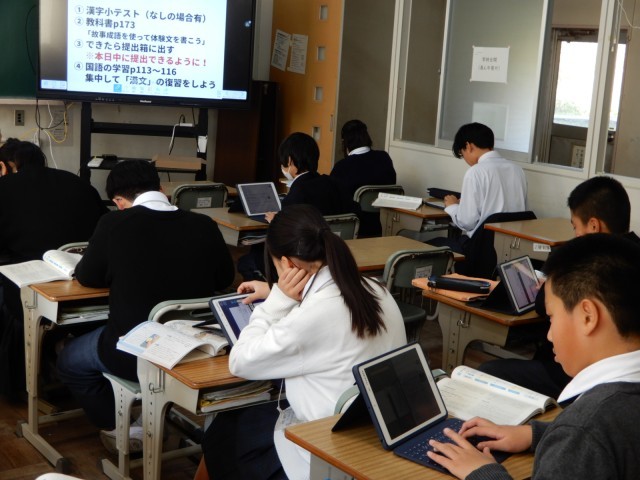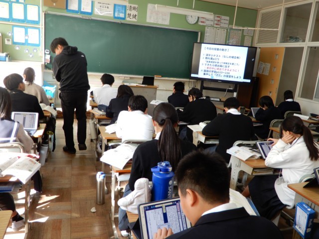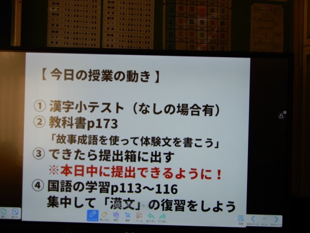 電子黒板に今日の1時間で取り組む内容が示されていました。授業の初めに今日は何に取り組むのか知り、学習の見通しをもつことは大切です。今日は故事成語を使って体験文を考えていました。