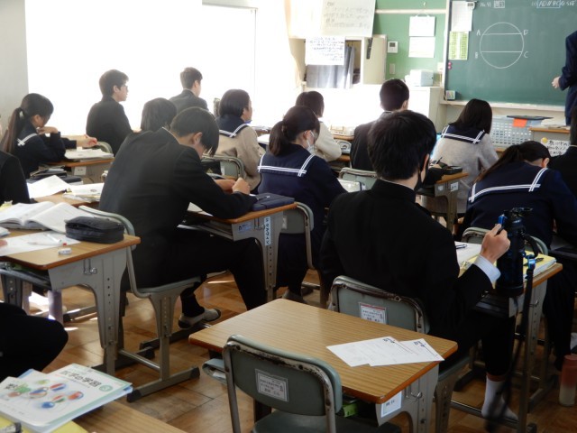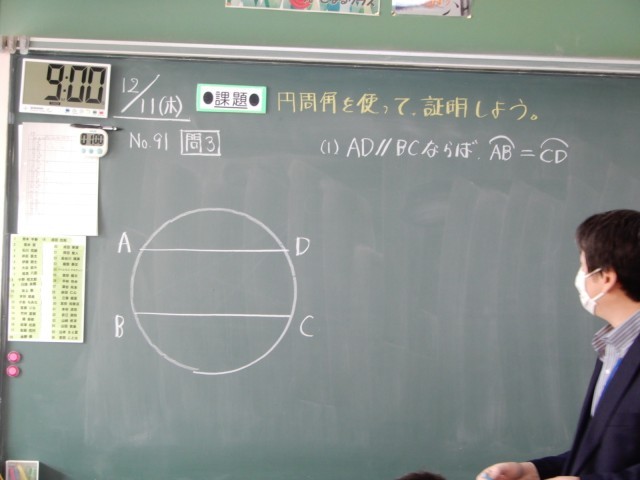 これまでに学習してきたことを使いながら証明の問題に取り組んでいます。今日は「弧、中心角、円周角」等の関係を考えながら取り組んでいました。