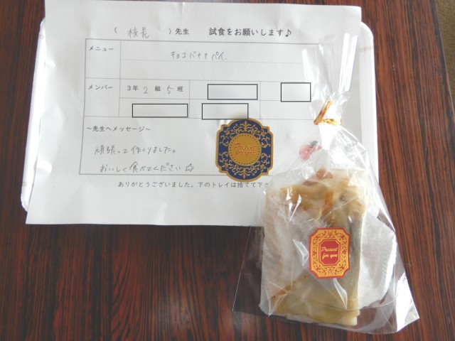 3年生が家庭科で「幼児のおやつ 春巻きの皮でチョコバナナパイ」を作りました。校長室にも幼児のおやつをもってきてくれました。とてもおいしかったです。ごちそうさまでした。