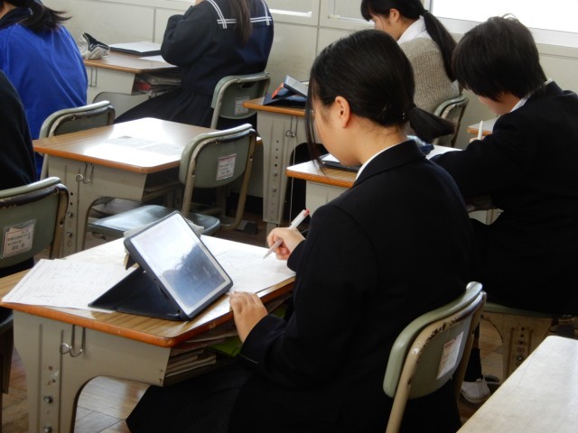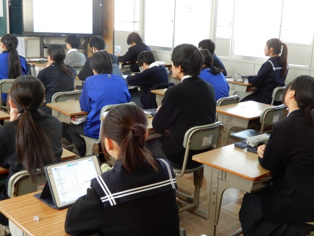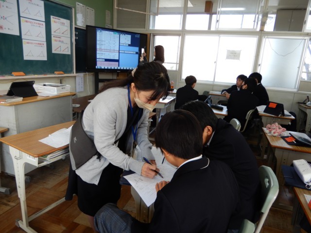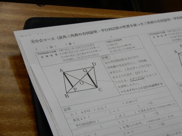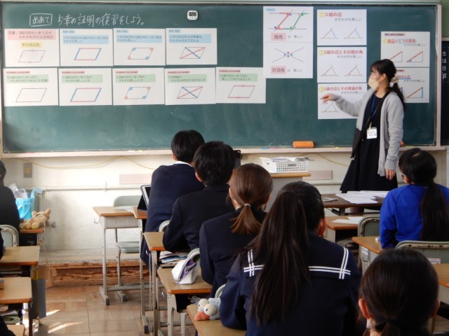 二年生の数学で授業研究を行いました。これまでに学んだ三角形の合同条件や平行四辺形の性質や定義を活用して証明問題に取り組んでいました。三段階のコースから自分で選択しながら、最初は個人で取り組み、その後教え合いも可能な授業形態でした。