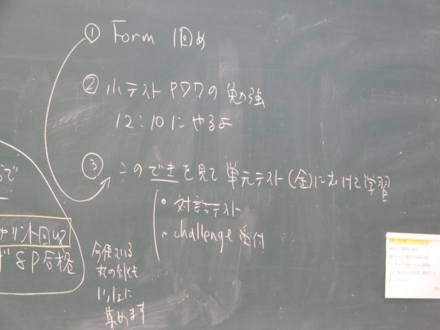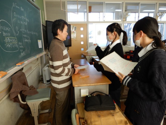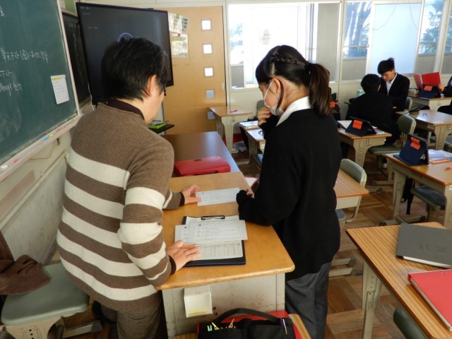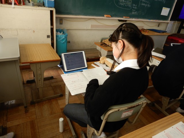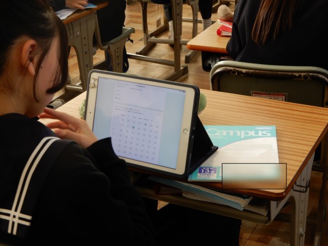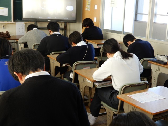 二年生の英語で授業研究を行いました。フォームによるテスト(繰り返しのテストの可)、確認の小テスト、対話によるテスト、単元テストに向けての学習など、一斉に取り組む時間、一人一人が自分で何をするのかを考え取り組む時間が組み合わされていた授業でした。