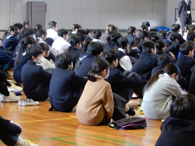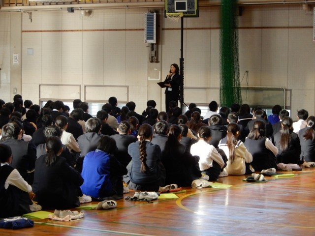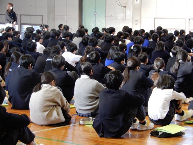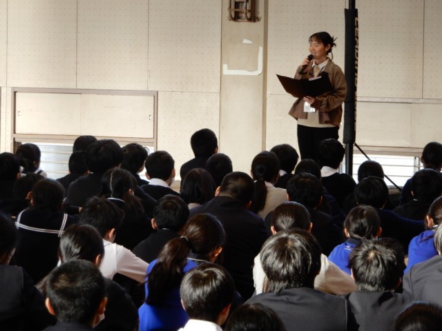一年生は体育館で学年集会を行いました。中学生になってからは初めての冬休みです。学習や生活のことなど担当教員からの話をどのように受け止め、自分はどのような実践をするか具体的に考え実践できるとよいです。