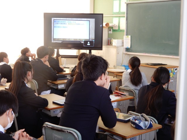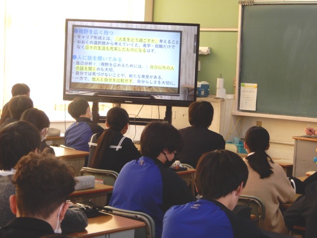 進路支援主事から二年生に向けて進路についての話がありました。初めての進路希望調査を持ち帰ります。ご家庭でもよく話をしてください。