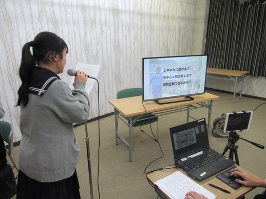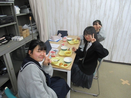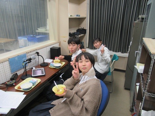 終業式給食の特別な日となった今日、生徒会執行部が昼の放送を運営しました。放送室の中でも執行部の生徒たちは大盛り上がり!とても楽しい企画放送を行ってくれました。
