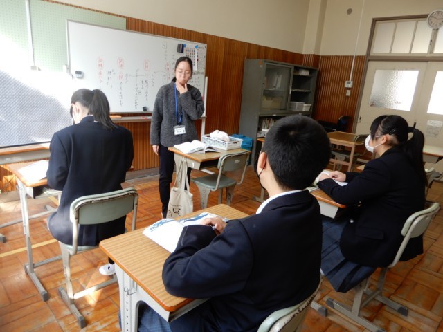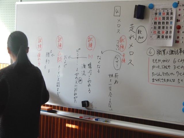 あおば学級の国語で「走れメロス」について、生徒と担当教員が言葉のキャッチボールをしながら学習を進めていました。