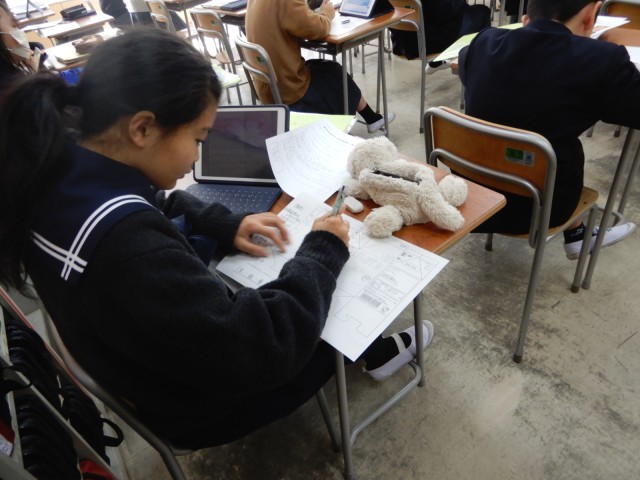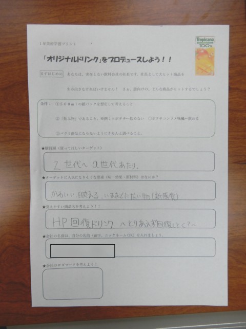 美術でオリジナルドリンクをプロデュースしていました。購入しそうな年齢層や味、商品名やロゴマークなど考え500mlの紙パックのデザインを考えるようです。