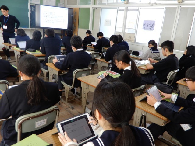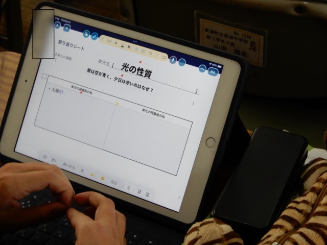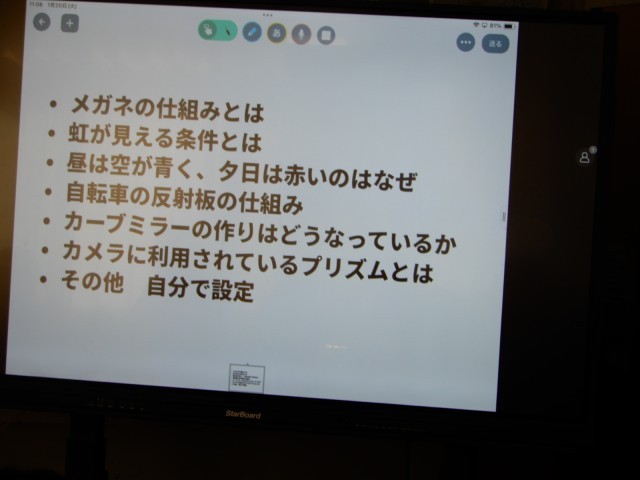 光の性質についての学習が始まったようです。単元の前半には担当教員からの知識等の説明が中心で、単元の後半からは電子黒板に示された内容(写真二枚目)について深めていくようです。
