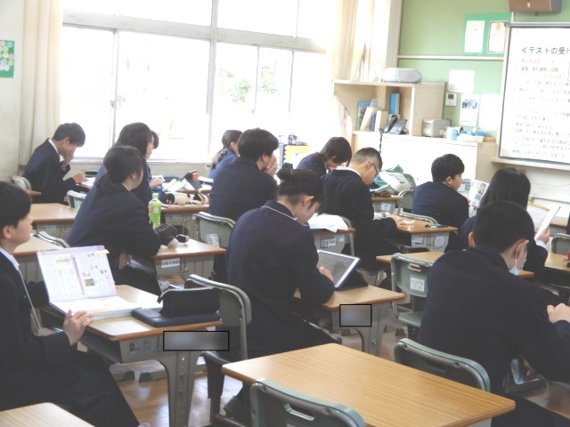 1年生と2年生は今日と明日、学年末テストです。とても集中して、朝の時間に最終の確認などをする姿が見られました。また三年生の教室でもそれぞれの入試に向けて、朝の時間を活用して学習する姿が見られます。