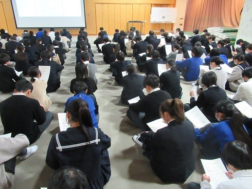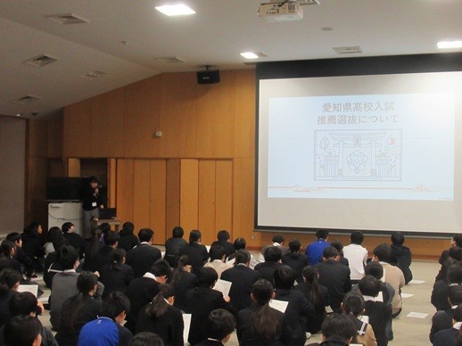 3時間目、多目的室で学年集会を行いました。内容は主に来年に控えた入試について、特に推薦選抜入試のシステムについて学びました。
