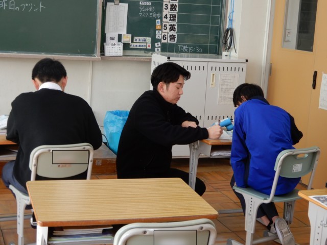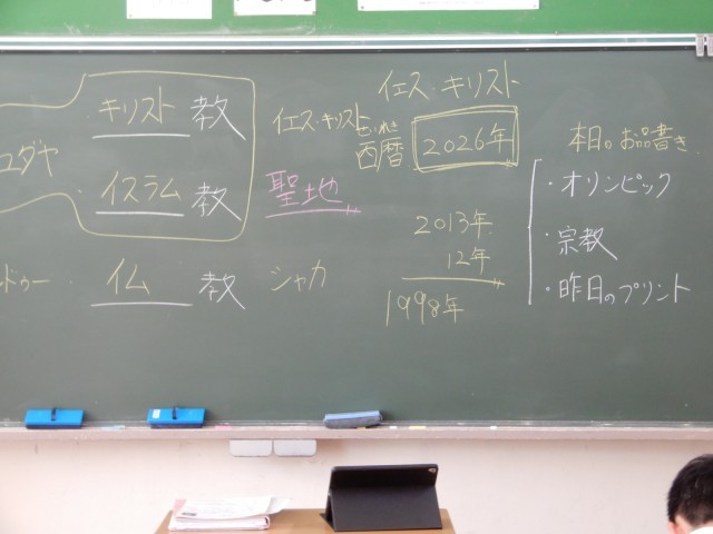 あおば学級の社会で宗教について復習していました。教科書を見ながら自分で確認などをする生徒、担当教員と話をしながら学習を進める生徒などそれぞれの方法で学習を進めていました。