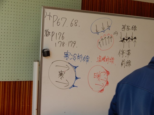 天気のことについて考えていました。担当教員が教科書を読み、自分が大切と考えているところに蛍光ペンで印をつけていました。集中して、聴くことと印をつけることを同時に行っていました。