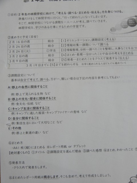 来年度の林間学校に向けて準備をしています。あおば学級では、二日目の体験活動について説明をしていました。また自分の興味関心のあることについて、テーマを設定し、考えて、調べて、まとめて、伝えるようです。とても楽しみな活動です。