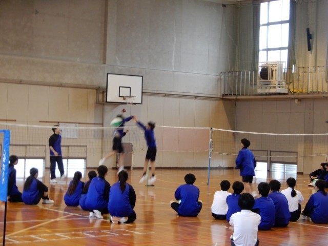 2年生が体育館でバレーボールに取り組んでいました。ボールやルールを工夫してリズムよく攻撃をする方法を考えていました。授業の終盤に、攻撃を工夫しているチームの試合を参観していました。この試合を見て自分たちの次の試合に生かせるとよいです。