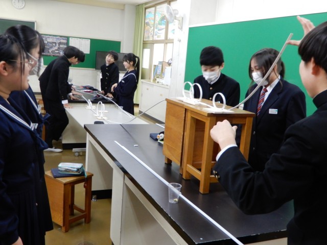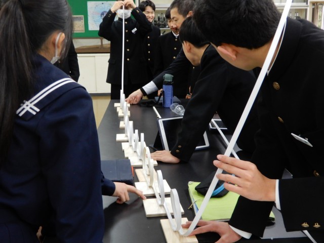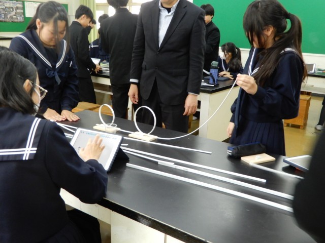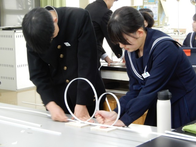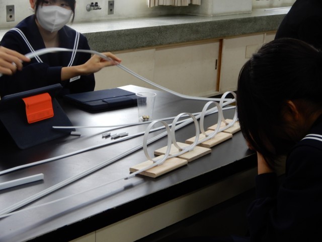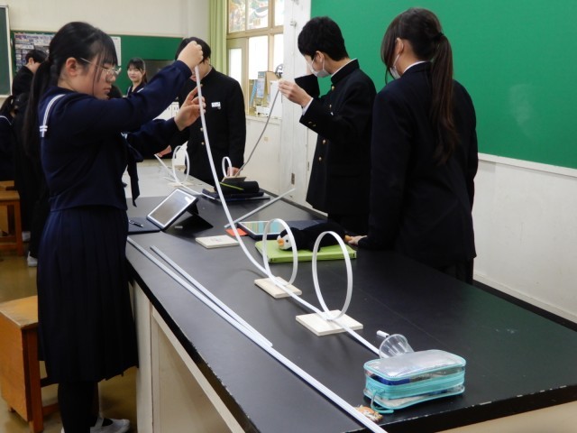 3年生の理科で授業研究を行いました。位置エネルギーと運動エネルギーの関係を考えながら、ループコースターを10回転させるデザインを考え、その理論を説明しようとしていました。