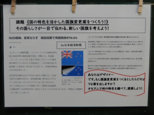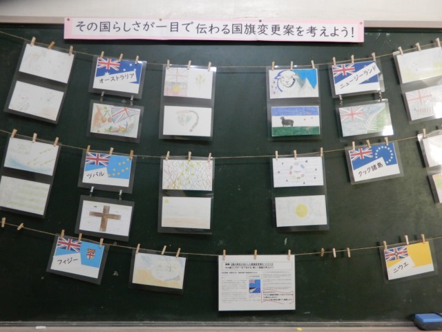 「もし、その国の特色を生かした国旗をつくるのなら(変更案を考えると)」という課題で、特色を生かした国旗を考えていました。それぞれが調べたことを生かしてデザインをしたようです。