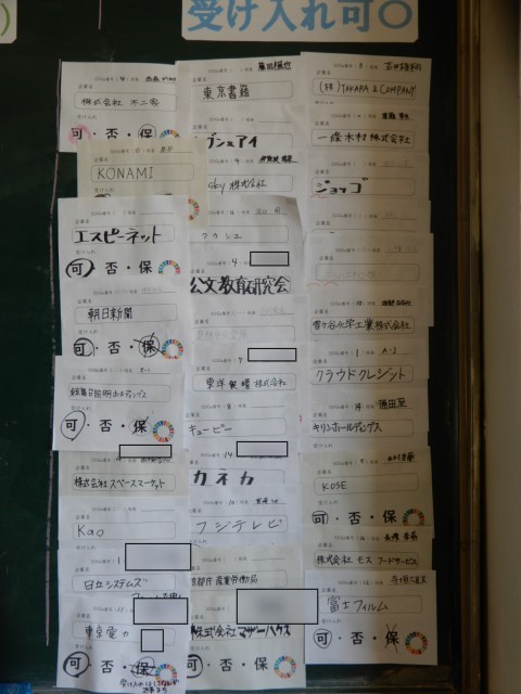 修学旅行の班別研修の企業訪問場所がかなり決まってきました。まだアポイントがとれなかったり、返事待ちの班はついに一桁となりました。次は訪問して何をするのかを考えていくようです。