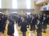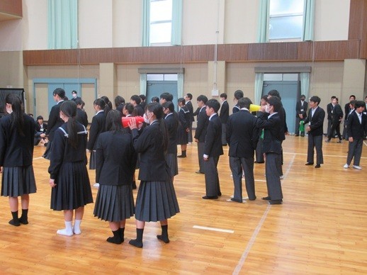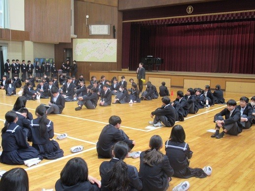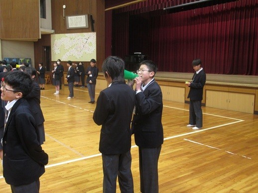 1年生が、1時間目の前半に先週に行えきれなかった学年レクリエーションの続きを行いました。内容は「伝言ゲーム」。各学級の代表8人がチャレンジしました。キーワードをもとにメガホンを使って小声で伝え合い、ゲームを楽しむことができました。