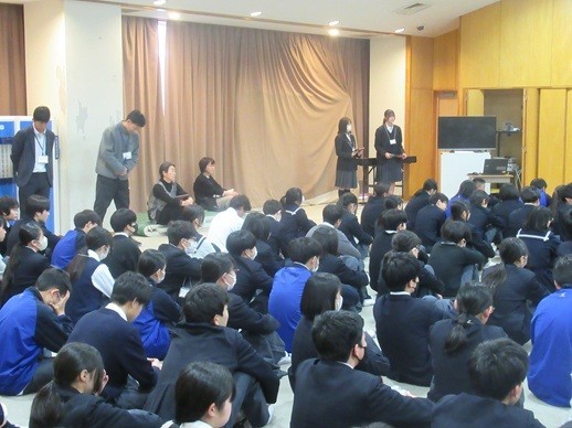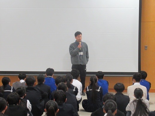 1時間目、2年生は多目的室で最後の学年集会を行いました。冒頭部分では、学年運営委員が1年間を振り返って発表しました。その後、学年の先生がそれぞれの担当の目線で来年度への叱咤激励の話をしました。