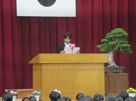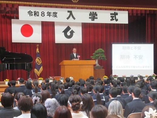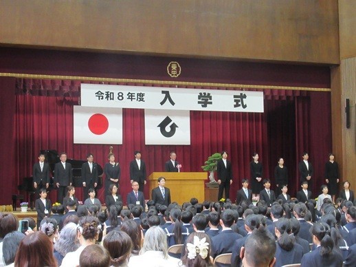 爽やかな天候のもと、令和8年度入学始業式を飛翔館で行いました(2年生はリモート中継による教室での参加)。プロジェクター・スクリーンを使って、校長式辞(内容は後ほどご報告いたします)を行い、在校生歓迎の言葉と新入生誓いの言葉をそれぞれの代表生徒が堂々と発表しました。