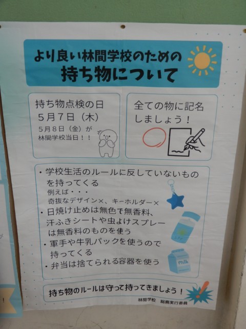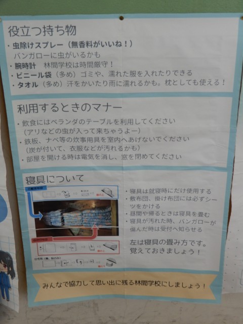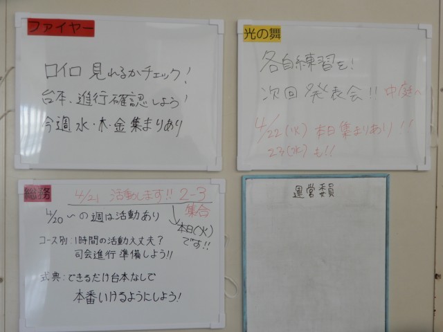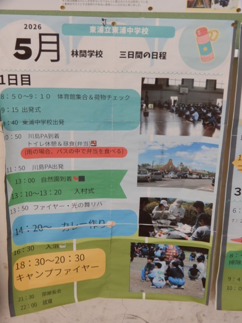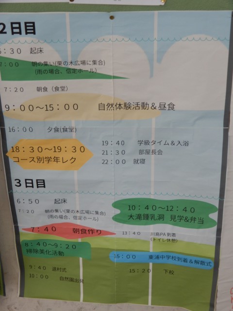 林間学校関係の学年の掲示板には、各実行委員の活動について指示が出ていました。それぞれの実行委員が自分たちで計画を立て、当日に向け準備を進めています。