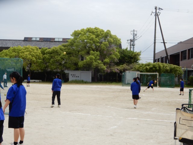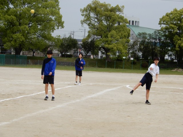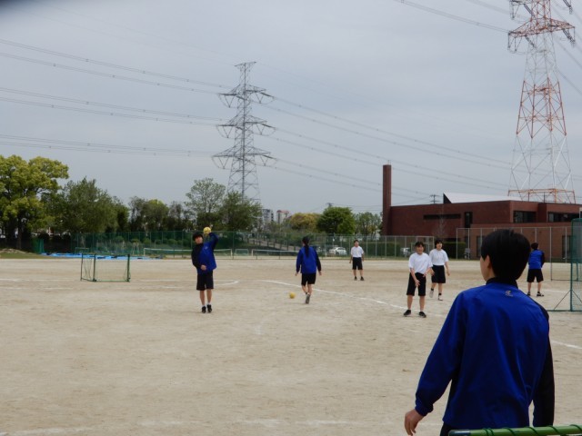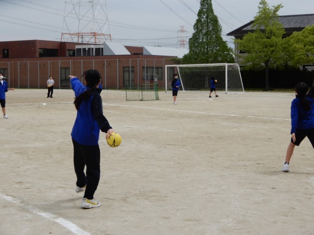 運動場でハンドボール投げをしていました。投げるフォームがよくよい軌道でボールがとんでいました。利き手と逆の手でも投げているようでした。