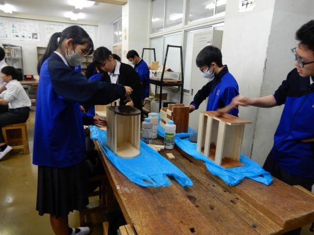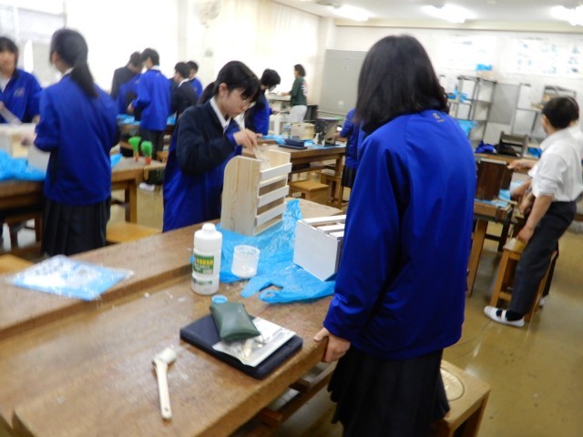 本立て等の木工の仕上げの段階で塗料を塗っていました。乾いた後にどのような仕上がりになるか楽しみです。