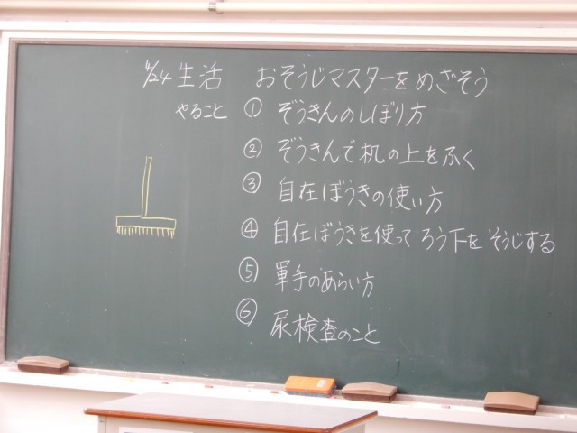 生活の授業で「おそうじマスターをめざそう」をテーマに掃除の仕方について学んでいました。胸の前から肘を伸ばしながら、上手にぞうきんをしぼっていました。
