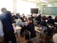 国語の授業で「枕草子」を学習しました。その後,形を引用し,自分ならではの季節感を表す文章を書きました。それをグループで読み合い,それぞれ1点ずつ選び掲示しています。自分と友達の季節の捉え方の違いや,共感できることを伝え合っています。