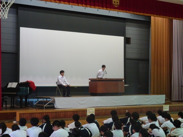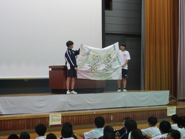生徒会役員・学級三役の任命、表彰披露に続いて校長講話がありました。今週末に行われる創立50周年記念式典、文化祭、自由参加の「ほくほく祭」で大切にしてほしいことについての講和がありました。教育実習生の自己紹介、生徒主事講話・ほくほく祭の留意事項、生徒会の活動報告も行われました。生徒会からは,今年のスローガン「若葉」の旗が出来上がったことが披露されました。