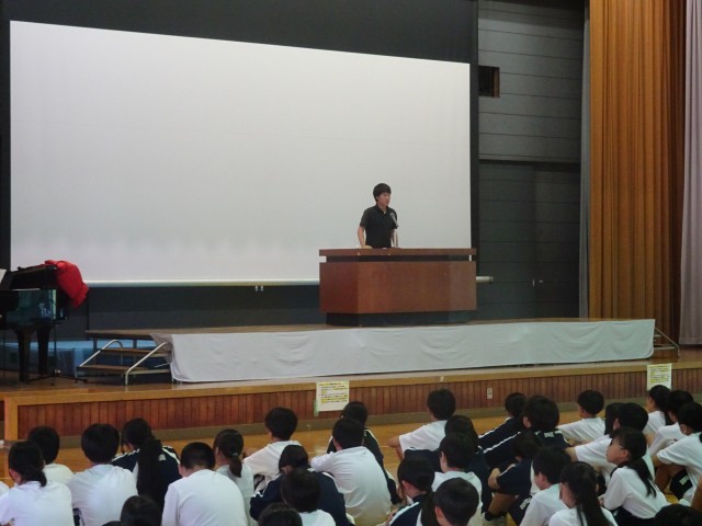 写真は,全校集会の様子です。熱中症対策で、体育館に全校生徒が集まることを控えていたため、久しぶりの対面での全校集会となりました。