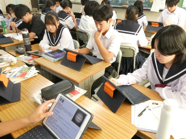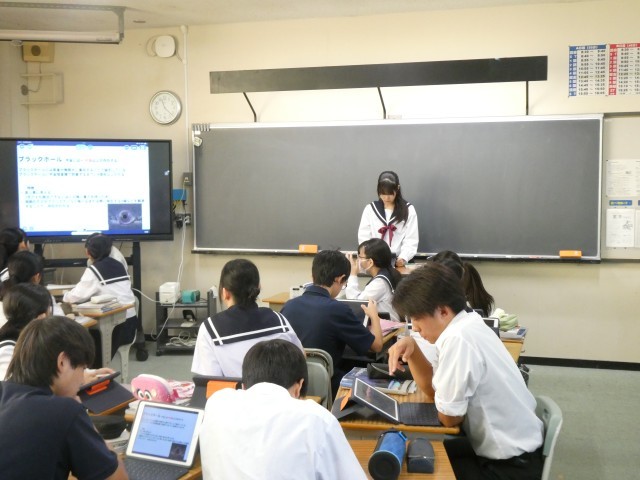 理科の授業では、天体レポートの発表を行いました。自分の興味のある天体の特徴を調べ、他の人に発表をしました。1つの天体についてより詳しく学ぶことができました。