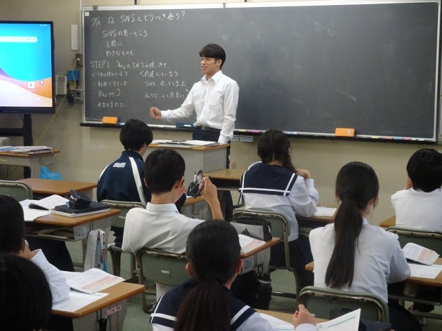 道徳「SNSの安全な使い方」の授業の様子です。教育実習生の研究授業として行われました。