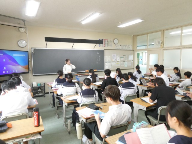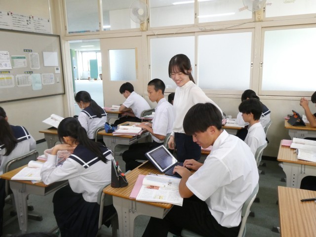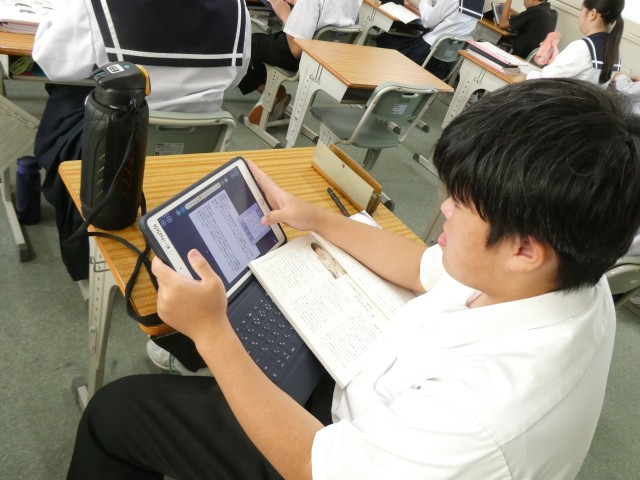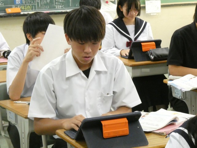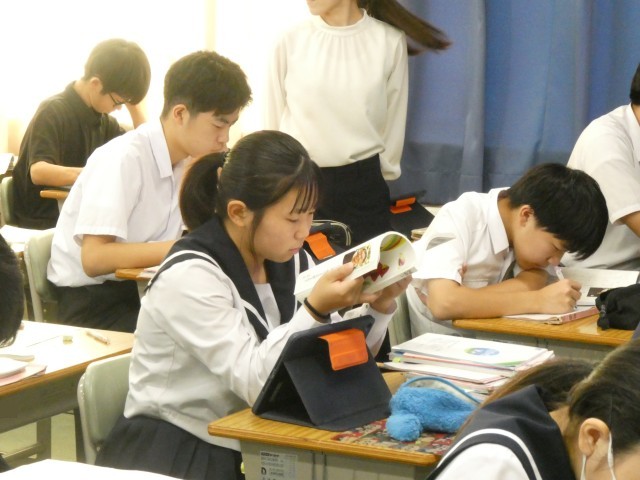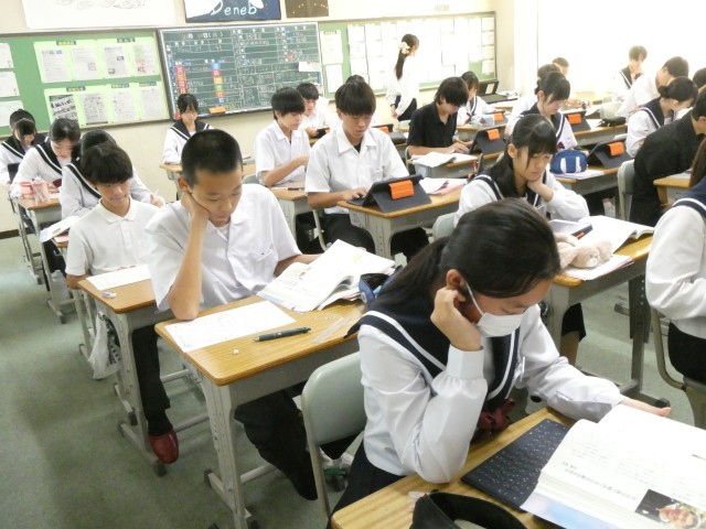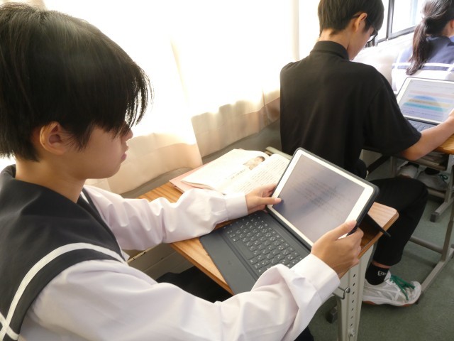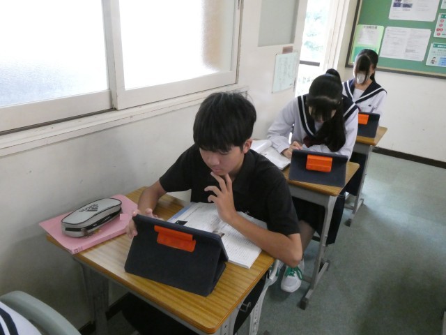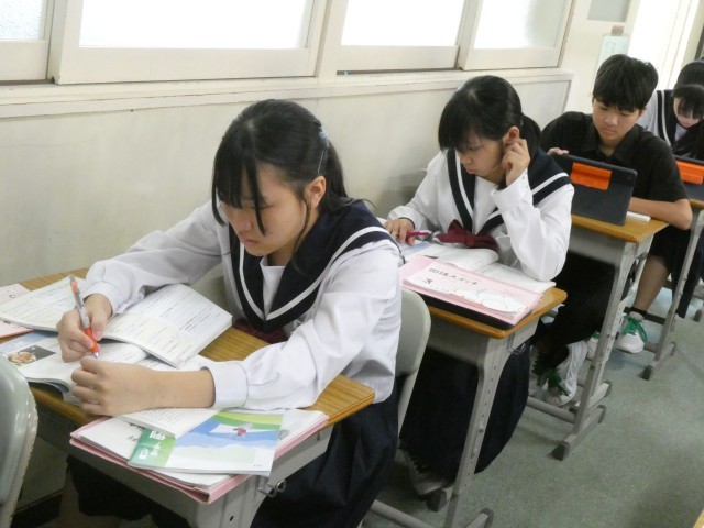 国語の授業ではマイプラン学習に取り組んでいました。環境問題に対するさまざまな人の意見を読み、多角的に分析して自分なりの考えをまとめていました。よく集中した雰囲気で取り組めていました。