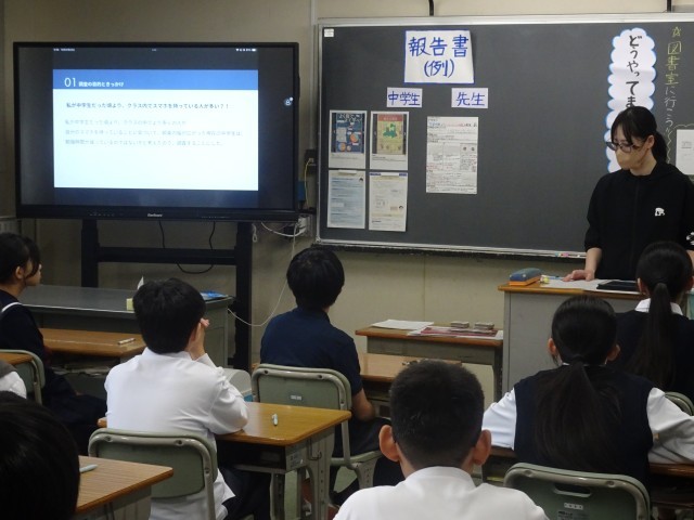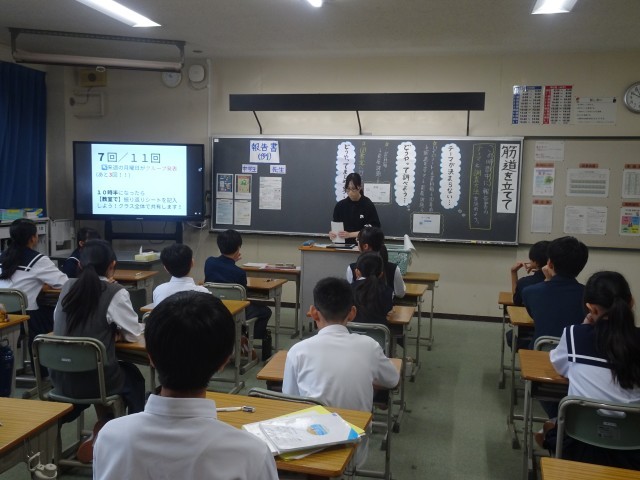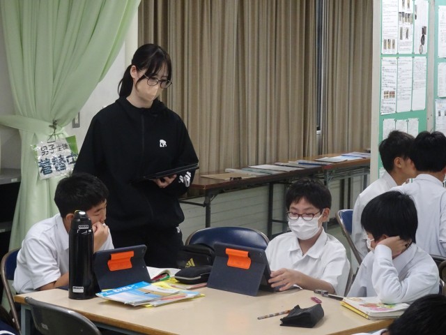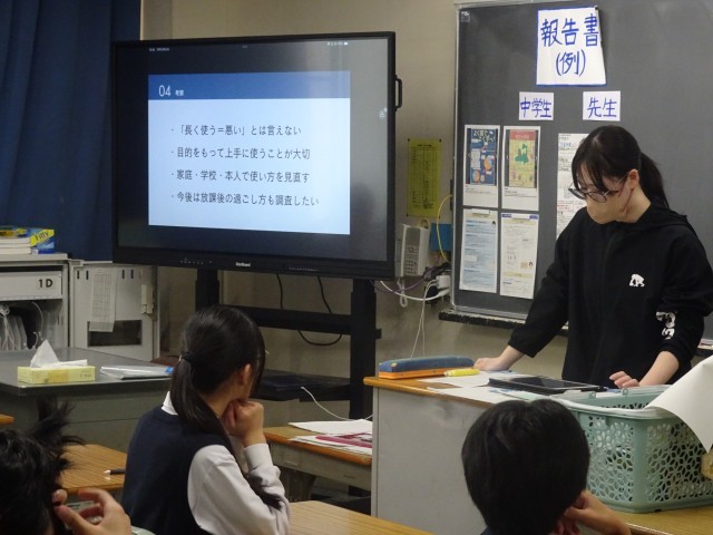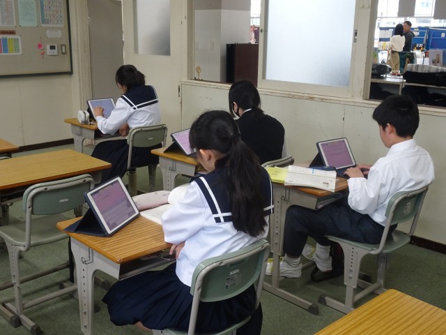 写真は、単元「筋道を立てて」の学習の様子です。自由進度学習を取り入れた「マイプラン学習」として進めています。伝えたい事実や根拠を明確にして、自分の意見や考えたことを分かりやすい文章にまとめることを目指しています。単元の最後のグループ発表に向け、レポートやスライド形式など自身で選択した形に、考えをまとめて記述しています。