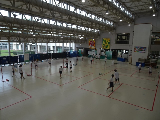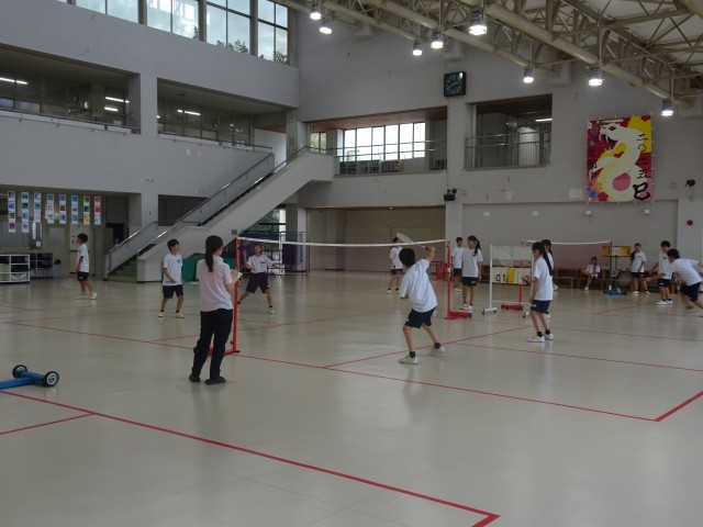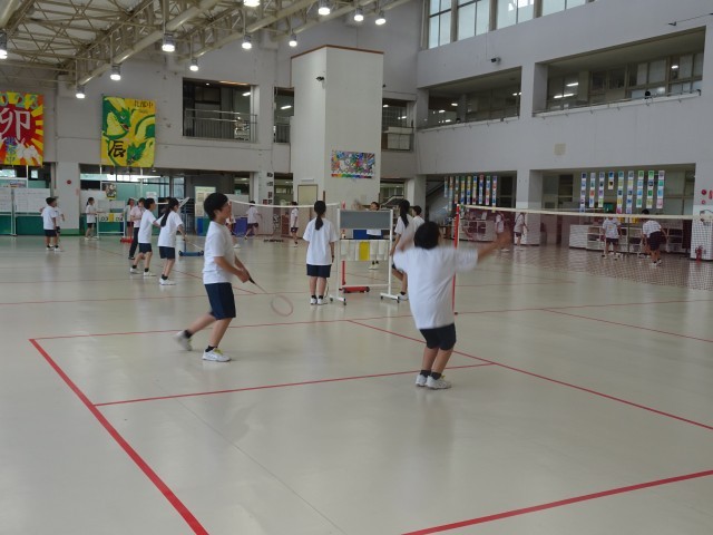 写真は、「バドミントン」の学習の様子です。昨日から、体育館のエアコン設置工事が始まったため、体育の学習の一部は、ホールで行っています。今日のバドミントンもホールで行いました。ホールでも、熱のこもったゲームが繰り広げられていました。