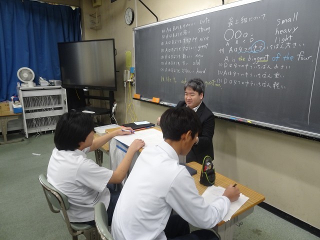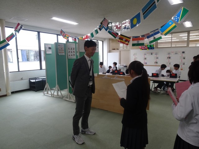写真は、「比較級・最上級」について学んでいる様子です。「マイプラン学習(単元内自由進度学習)」として、個別に進めています。必要に応じて、教科担当の先生に、教えてもらったり、確認したりしながら学習を進めています。提示されている課題の中に、「インタビュー課題」があり、「Which do you like better, A or B?」を最終的に尋ねることとされています。学年の先生や、職員室で仕事をしている他学年の先生を訪ねて英会話をし、先生にサインをしてもらっています。私も、質問してくれたみなさんに回答しました。