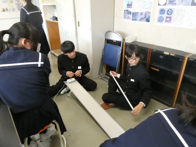 理科の授業では「力が働かない物体」の運動について調べました。斜面を下りきったあとの台車の運動を記録テープで記録することで速さの変化を調べました。次回グラフを完成させていきます。