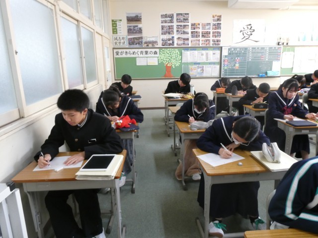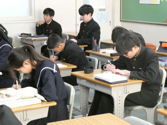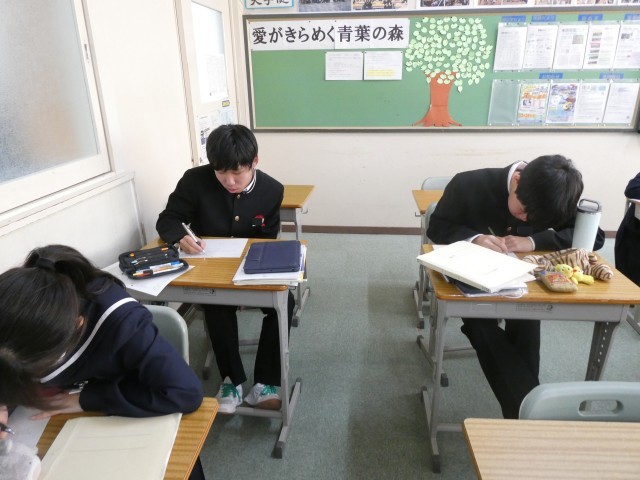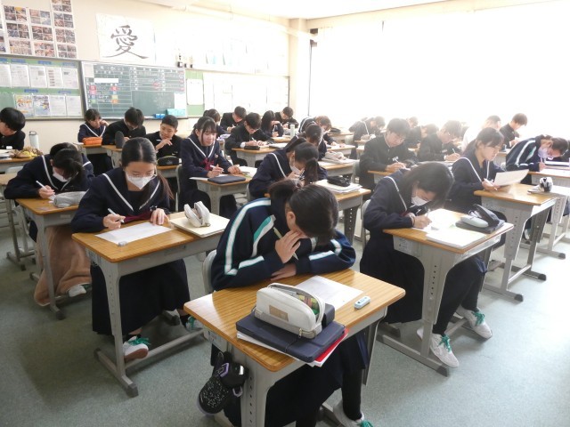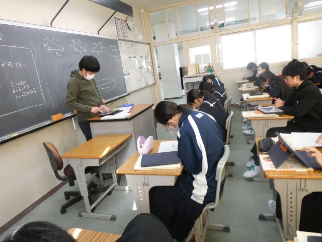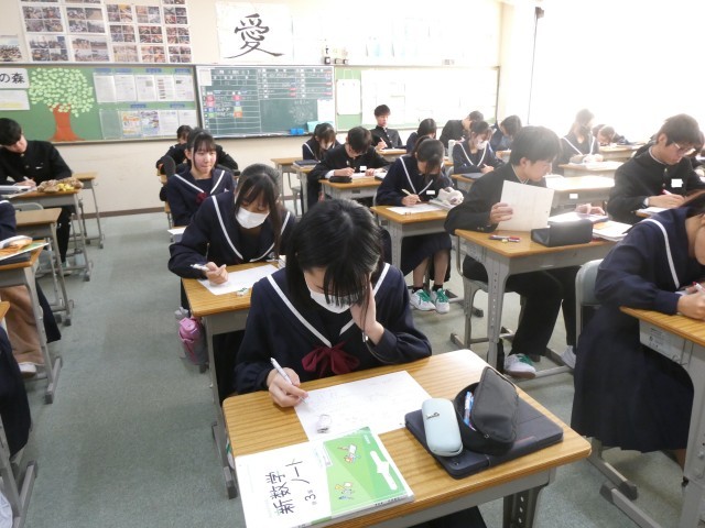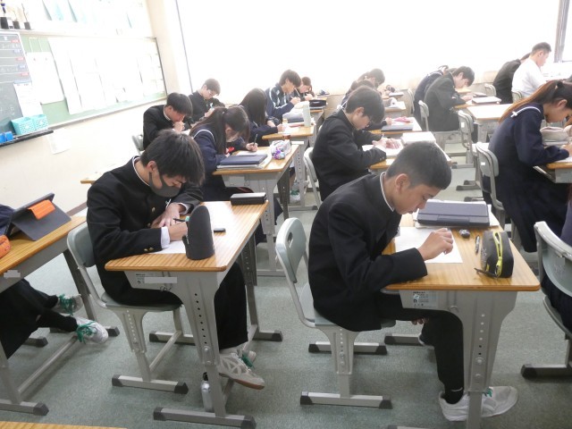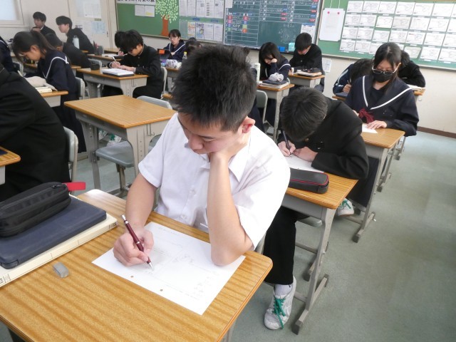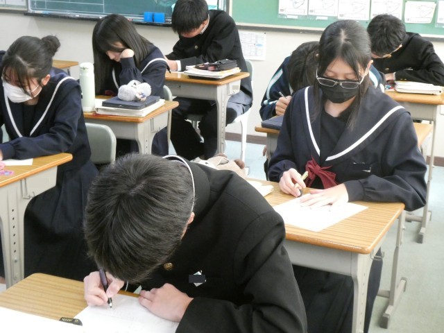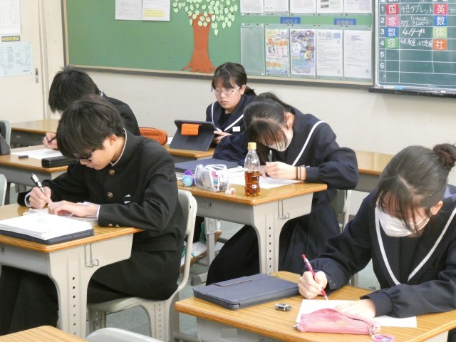 数学の授業の始めでは、入試問題を数問解いています。先生からプリントが配られ、黙々と各自で解いていました。日頃からさまざまなレベルの問題演習を行っています。