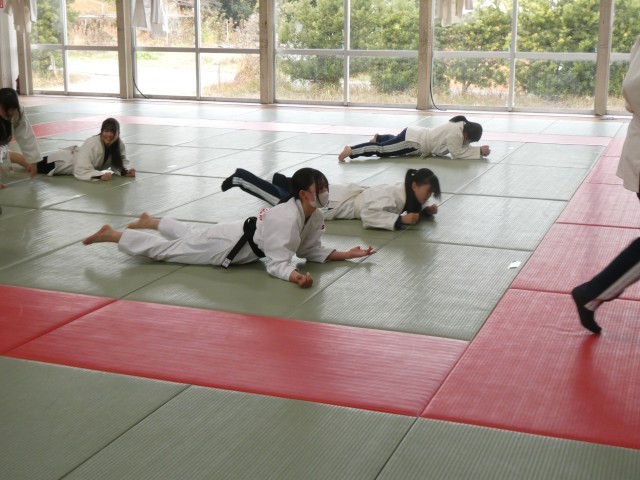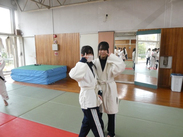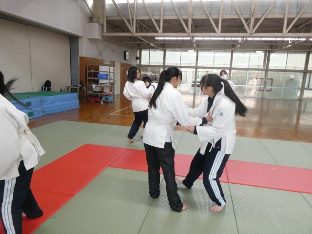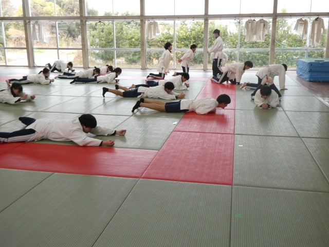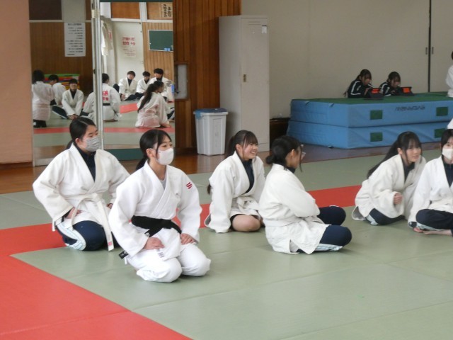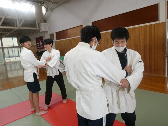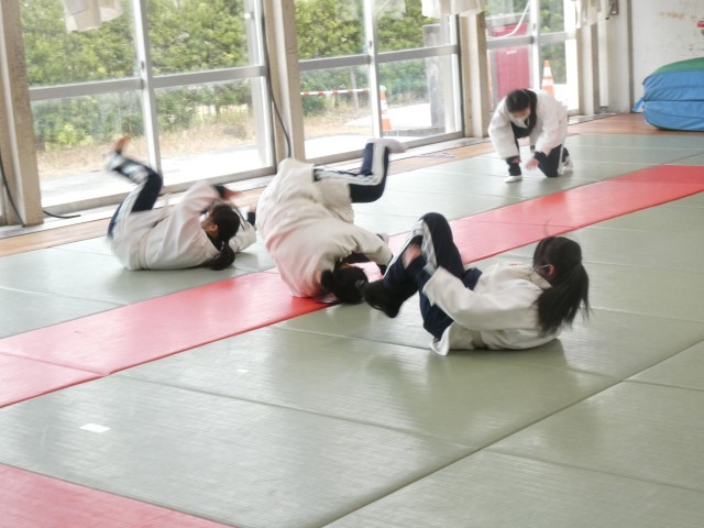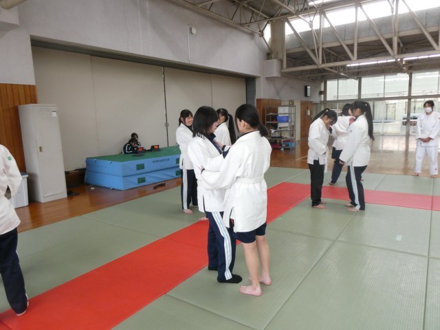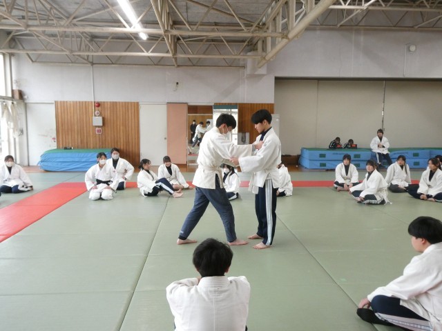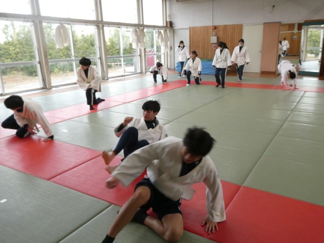 体育の授業では、柔道を行っています。今日は、受け身の練習を行った後、2人1組になり、組む練習をしていました。真剣に先生の話を聞く様子が見られました。