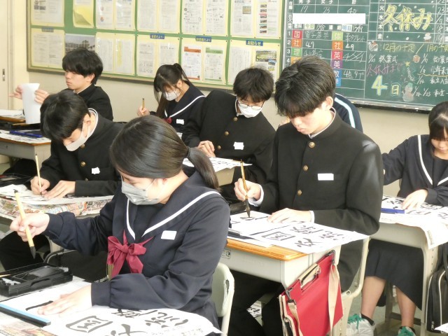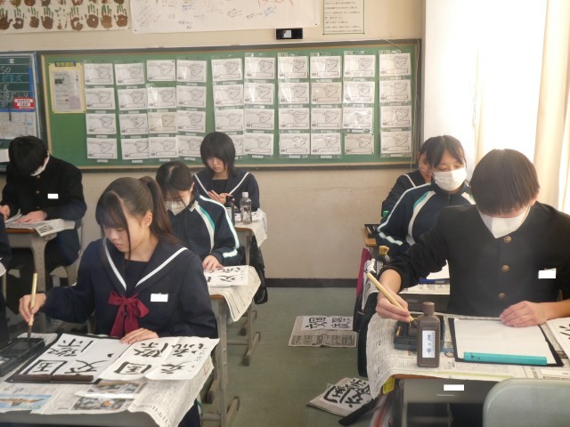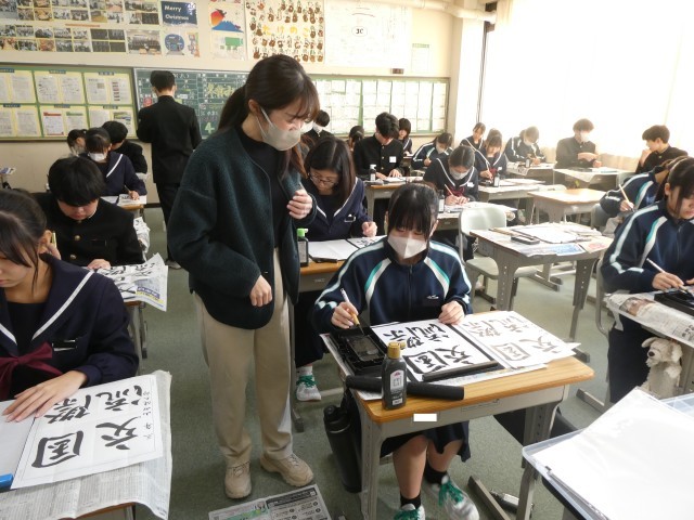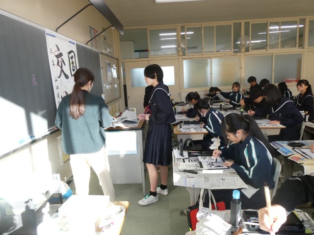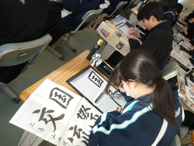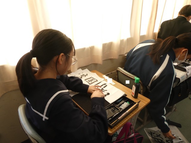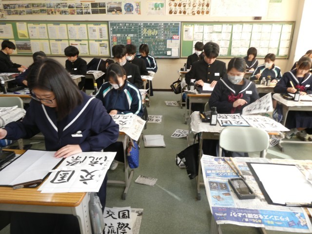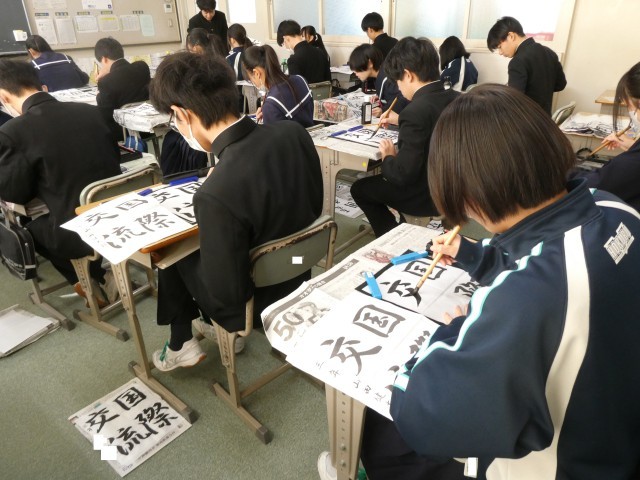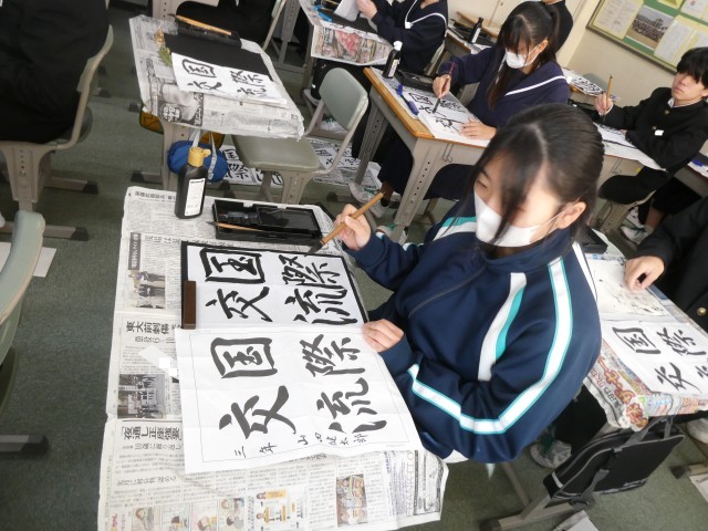 国語の授業では、書道を行っています。「国際交流」という文字を行書で書いていきます。中学1年生からやり始めた行書もだんだんと上手くなっています。
