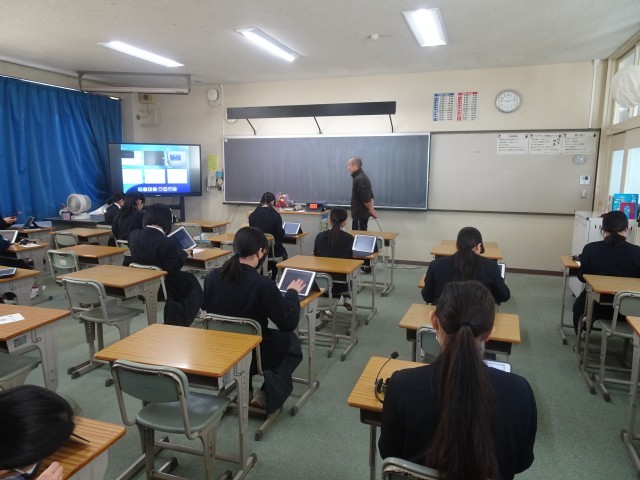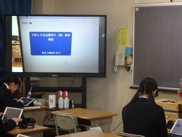 実際に調査を実施する3年生の教室に生徒が入室、教師の説明やモニタに映し出される画面を参考に、各自のタブレットを操作して検証しました。