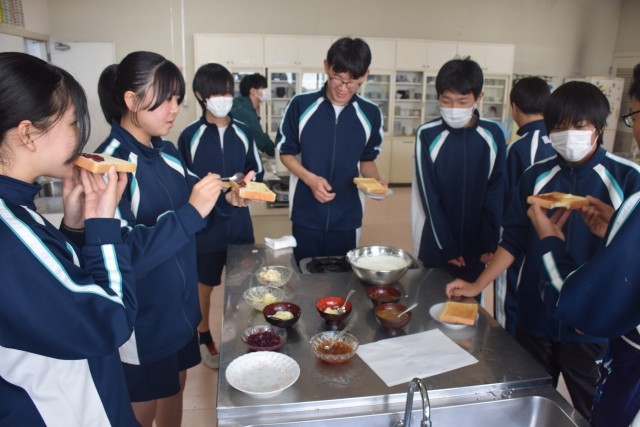 4月11日(土)の午前中、町おこし事業実行委員会(通称「ひがポ!」)のメンバーが北部中学校の家庭科室に集まり、原料からジャムや焼き肉のタレ、バターづくりに取り組みました。