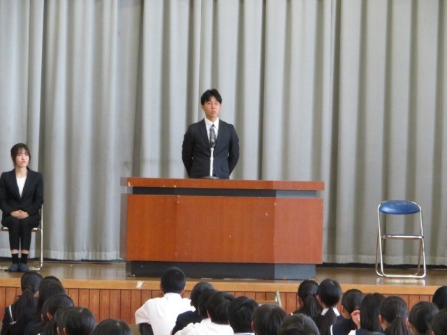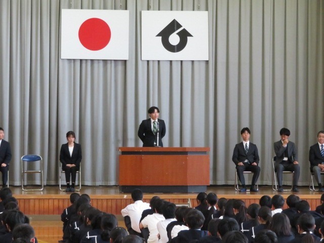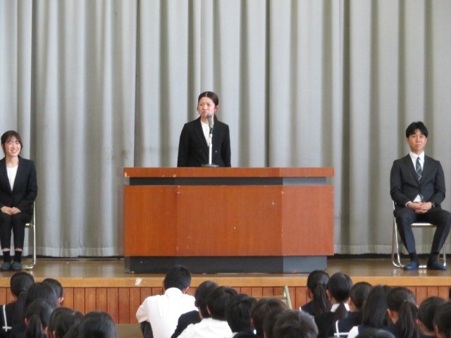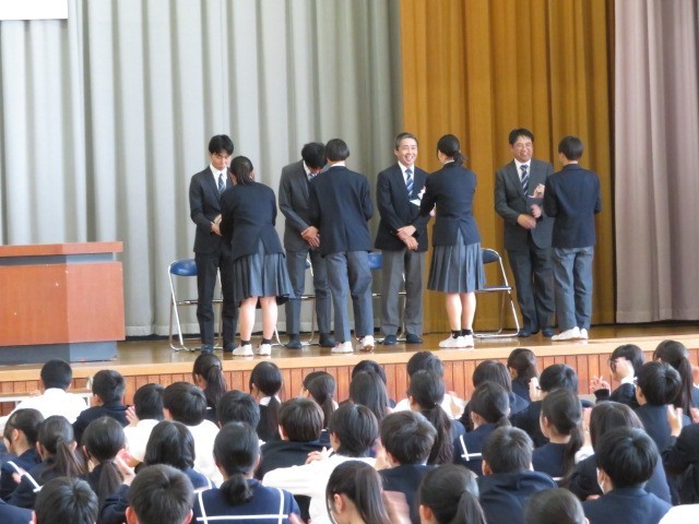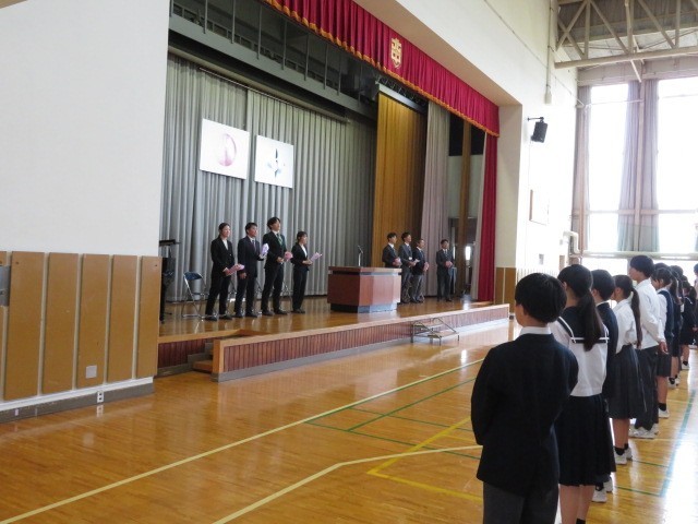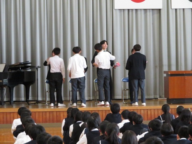 式では、離任される先生方お一人おひとりから、本校での思い出や生徒たちへの熱いエールが送られました。生徒代表からの感謝の言葉と花束贈呈では、涙を浮かべる生徒の姿もあり、別れを惜しむ温かな時間に包まれました。