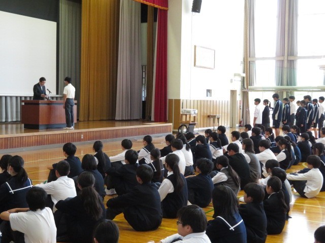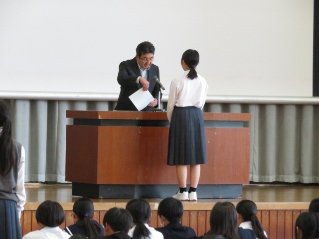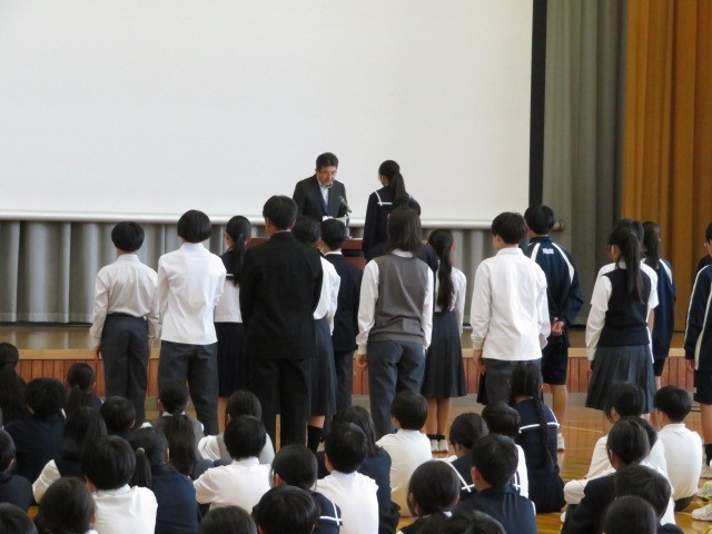 集会で各学級の前期級長・書記・代議員の任命式がありました。各学級から選ばれた新学級三役の代表が校長先生より任命状を受け取りました。