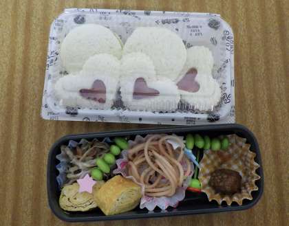 サンドイッチをハート型にくり抜き、ジャムが見えるようにして彩りまで考えた素敵なお弁当が!見た目からおいしいとわくわくしますね♪