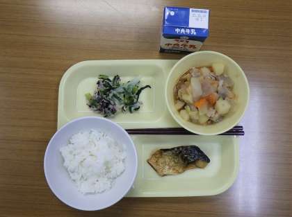 今日の献立は、ご飯、牛乳、さばの塩焼き、肉じゃが、チンゲンサイのゆかりあえでした。