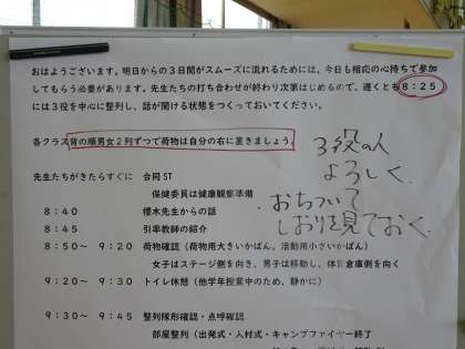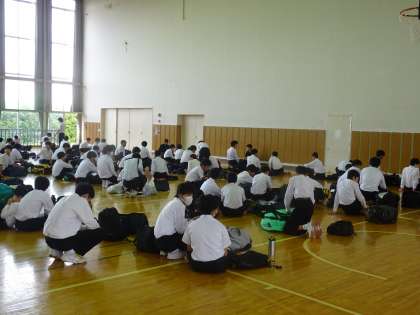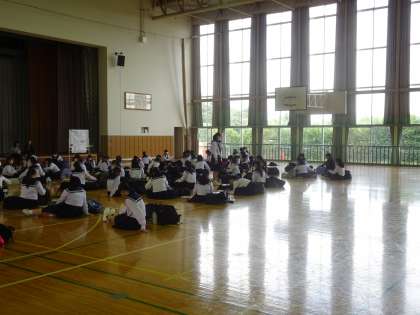 2年生は、明日からの「自然教室」に向けて、これまで準備してきたことの最終確認を行い、3日間の生活の見通しをもつ活動を行っています。写真は、各自の荷物確認の様子です。男女別に分かれて行っています。このあと、3日間にわたって大切にすべきこと、動きについて確認をします。