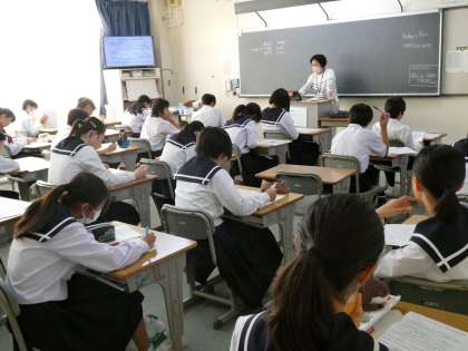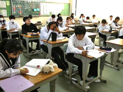 今日・明日と午前3時間授業後に給食を食べて午後の授業です。写真は午後の授業の様子です。中間テストが終わりテスト返しをしている教科もありました。