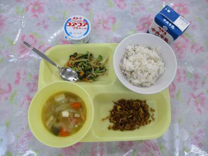 今日の献立は、麦ご飯、ビビンバ(肉・卵)、ビビンバ(野菜)、フォースープ、ヨーグルトでした。